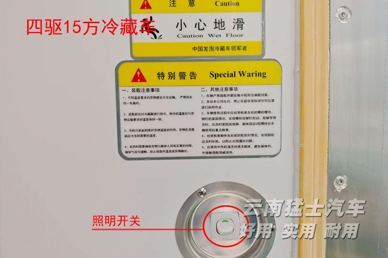 冷藏廂體內(nèi)部裝有一盞照明燈,地板采用了帶有凹槽的鋁合金花紋板,貨物在裝運(yùn)過(guò)程中融化產(chǎn)生的水可順著凹槽流進(jìn)排水口,避免貨物浸泡和地板結(jié)冰打滑。