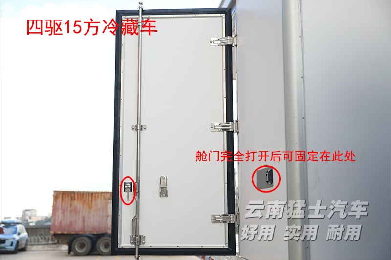 該車(chē)?yán)洳貛w內(nèi)長(zhǎng)3600mm寬2200mm高1900mm,采用VR食品級(jí)玻璃鋼蒙皮,中間填充高密度保溫泡沫,棱角處做鋁合金包邊處理,可容納15方貨物。裝配凱達(dá)580制冷機(jī),制冷機(jī)運(yùn)行均在駕駛室內(nèi)操作完成,無(wú)需下車(chē)操作。廂體右側(cè)有一扇單開(kāi)小門(mén),采用集裝箱門(mén)結(jié)構(gòu),完全打開(kāi)后可固定在廂體上,從下方護(hù)欄進(jìn)入廂體內(nèi)部。廂體尾部為對(duì)開(kāi)式集裝箱門(mén),左右可270°開(kāi)啟,固定在左右?guī)w邊板。